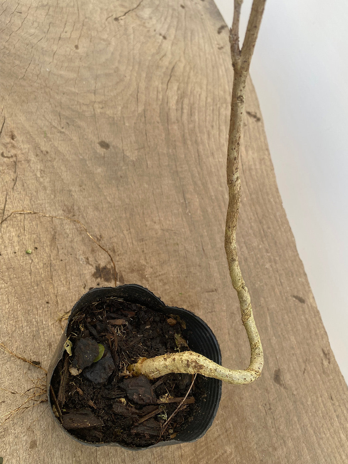 It is in a thin plastic 4" round pot. The seedling is approximately pencil thickness.