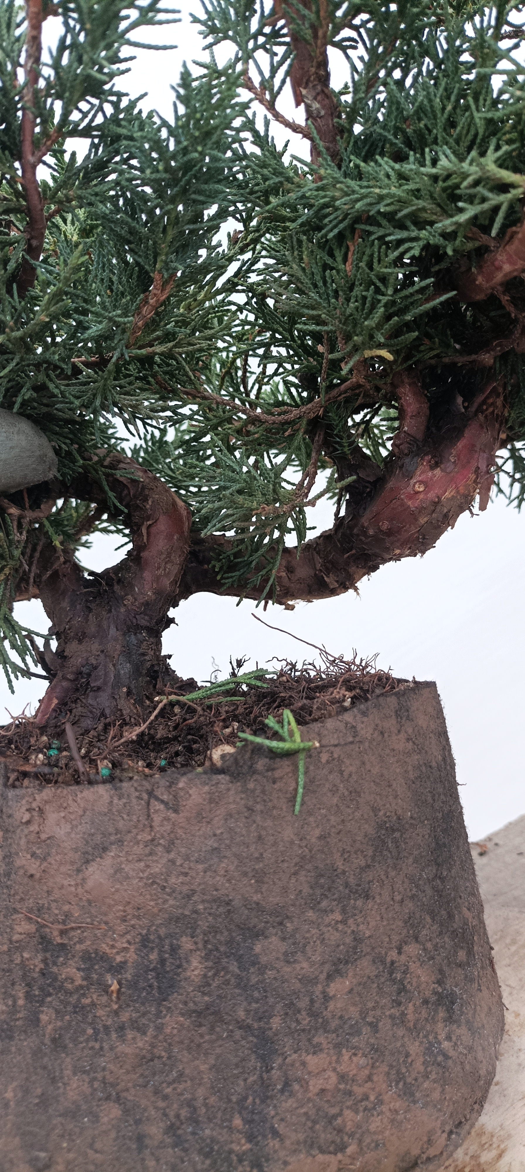 The nebari is around 2" and it has been twisted and bent to become a shohin or chuhin. Junipers are one of the hardest trees to photograph because of the density of the foliage, but you can trust me that this one is bendy and knotted up.