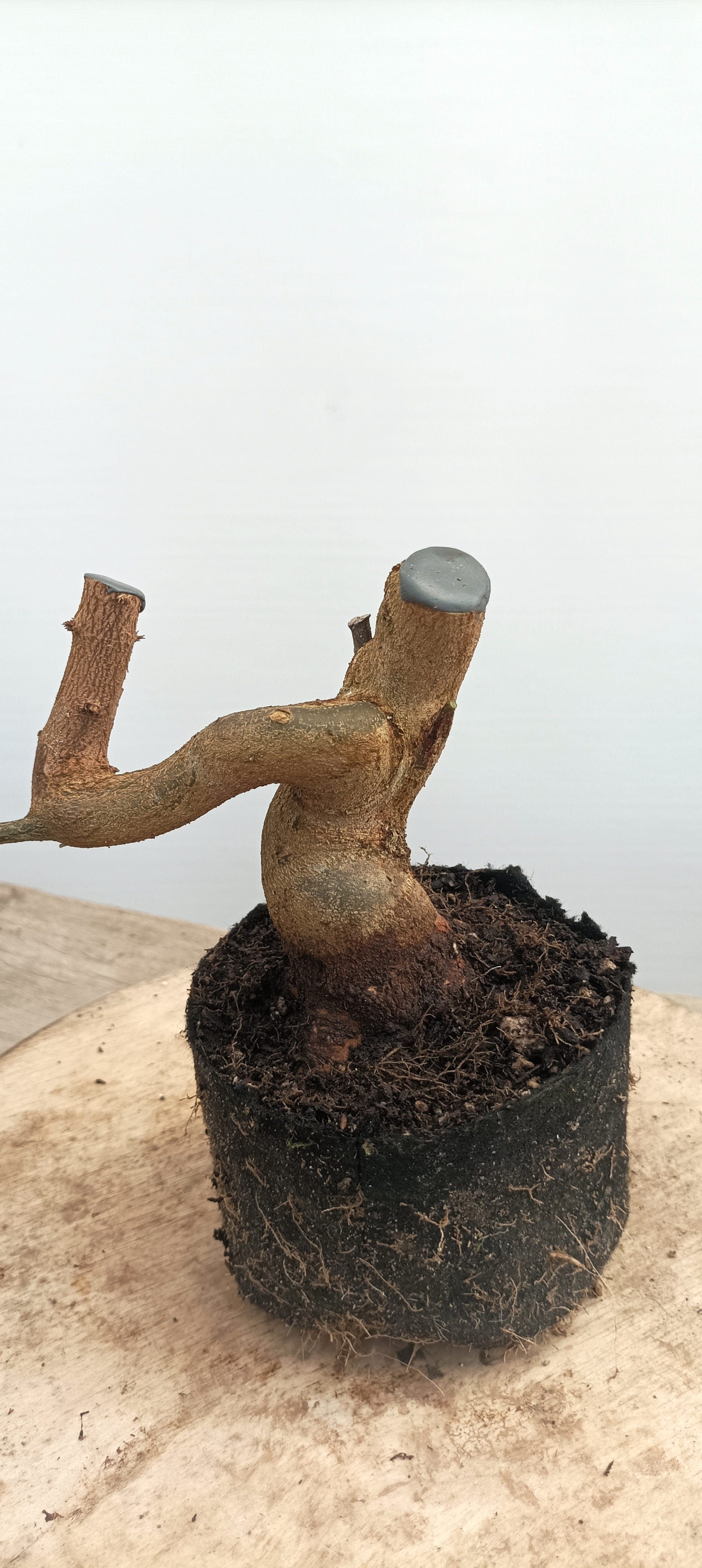 The bends and chops suggest a shohin eventually. It has had a few rounds of root work and some wiring. The nebari is around 2"